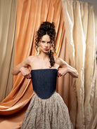 Double sided corsets are definitely representative for our brand identity A statement item that can be reused and repurposed endlesly. By having two sides yo can style it in different ways. One is created from blue denim and the other one from white peony printed cotton