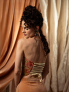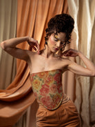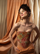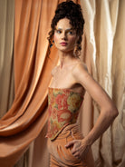 Limited edition velvet corset with a side of peach fuzz velvet and one of pink dusted roses print on tafta. Inspired by a famous corset created in 1603 during the Elizabethan Era.Peach Fuzz was declared the Pantone colour of year 2024 and it is symbolizing serenity & warmth.